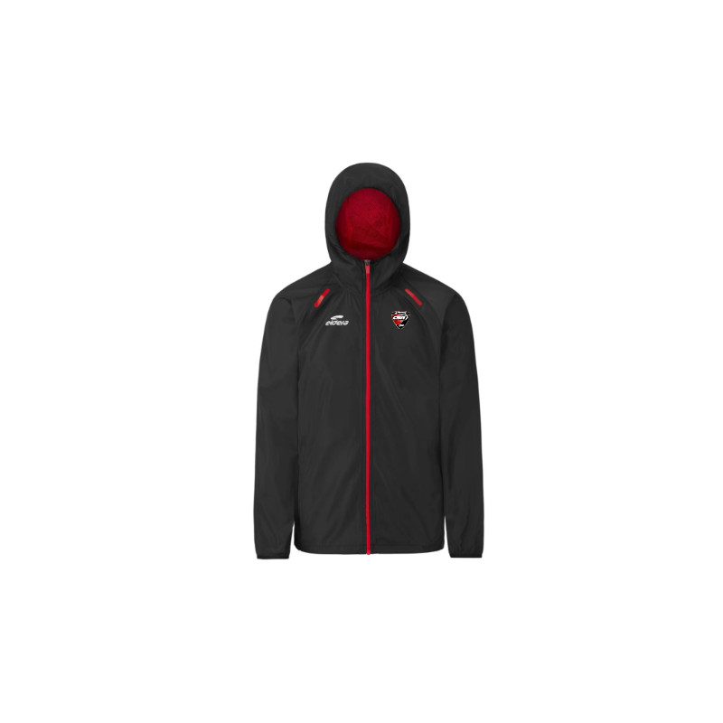 • Coupe vent en polyester avec finition hydrofuge (membrane déperlante ayant une résistance limitée à la pénétration de l’humidité • Capuche doublée en mesh • Poches latérales zippées contrastées • Serrage taille avec élastique bloquant • Manches élastiquées • Détails printés contrastants • Logos printés • Composition 100% polyester.